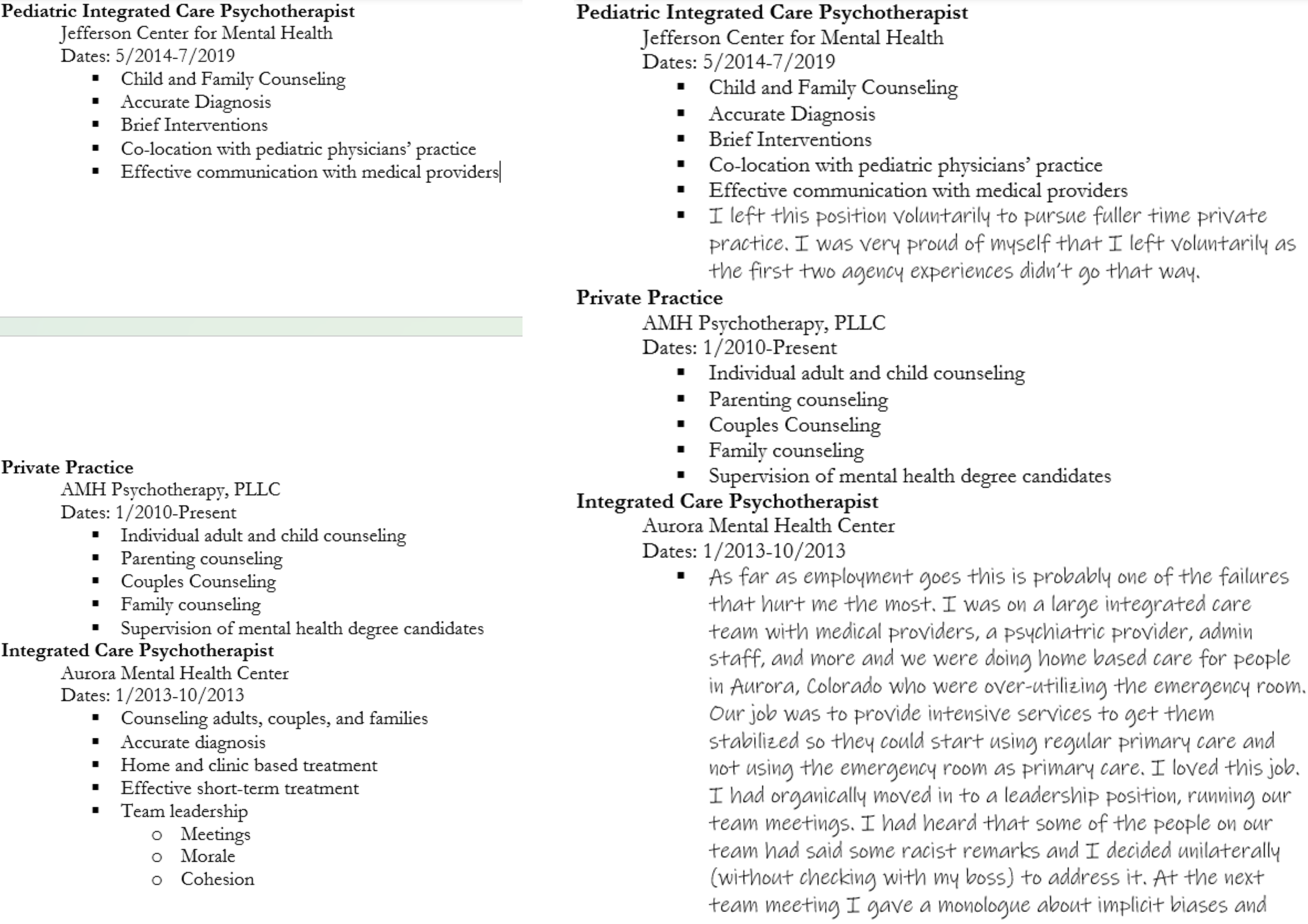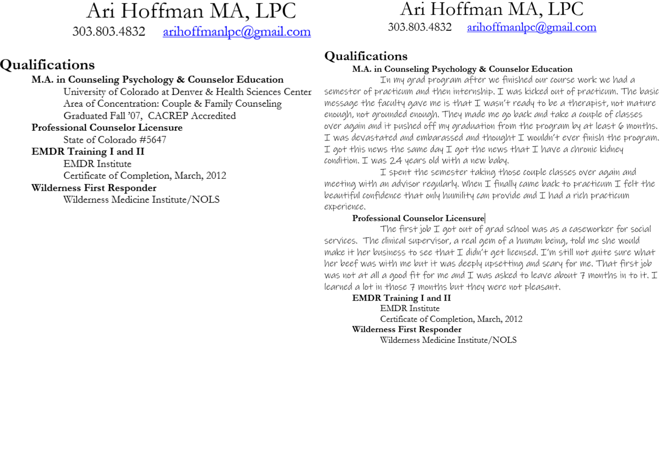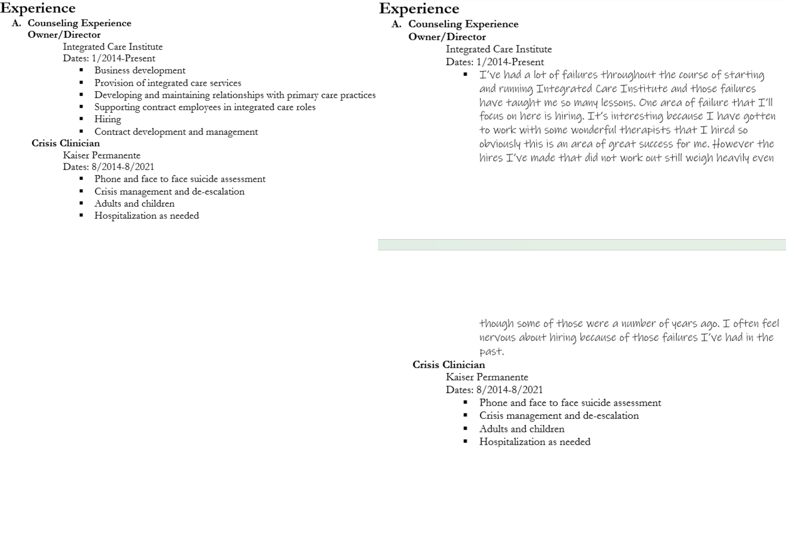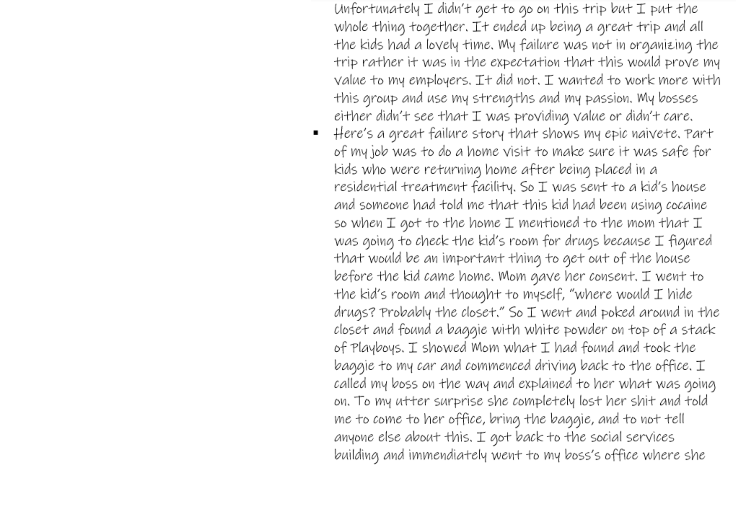 Here are my standard resume detailing most of my career (on the left) and my Failure Resume with anecdotes of my failures (on the right). I hope you enjoy reading this.